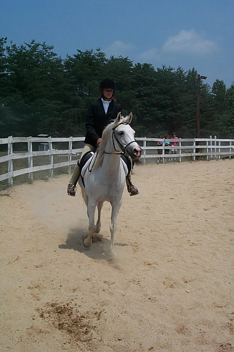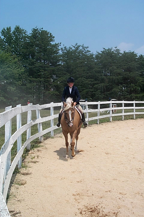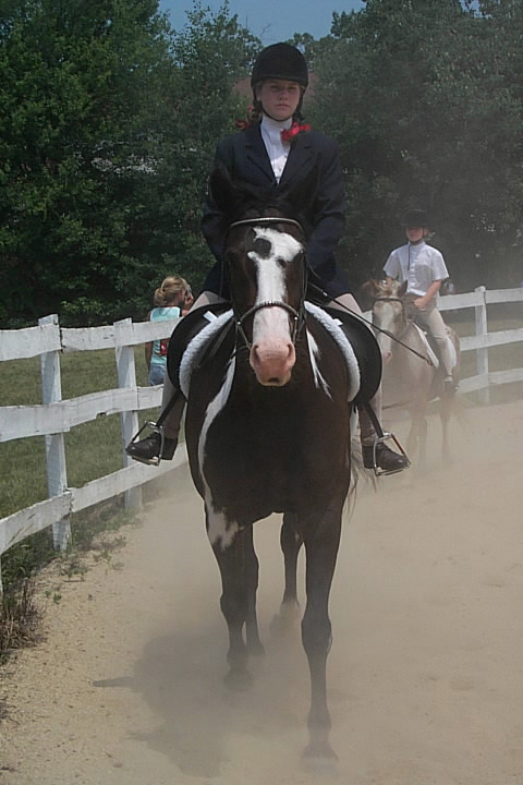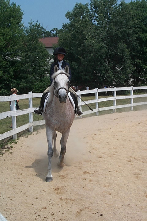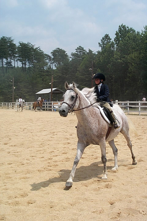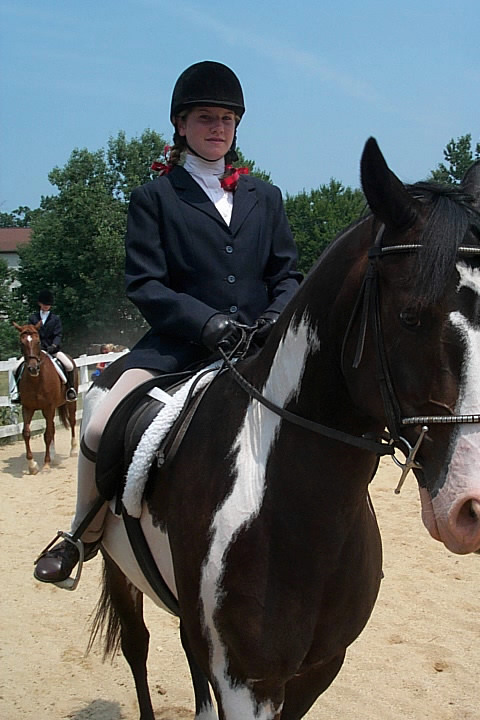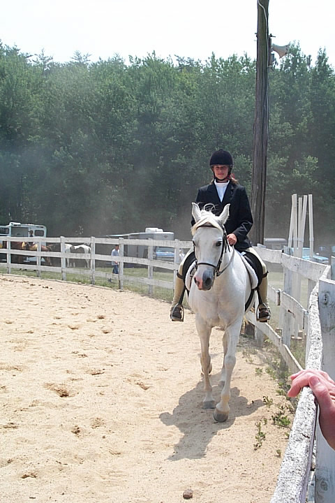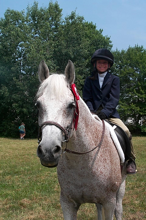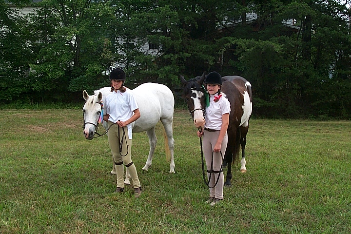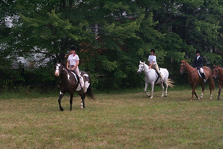 Here are a few snapshots of the girls at the July 20 Freestate Riding Club horse show. Other than the temperature being a bit on the steamy side, a good time was had by all. Many ribbons came home with us that day and the horses behaved very well. Jessica is the rider on Romeo, the black and white Paint/Arab gelding. Ali is on Silver Belle, the white Arab mare. Lydia is on Rocky, the Grey Arab gelding. Finally, Erika is on Sunny, the Palomino gelding. Romeo, Silver, Rocky, and Erika are all instructors at Obligation Farm. Click on any picture to see a larger version.