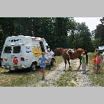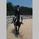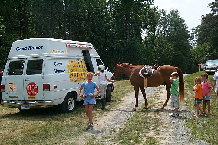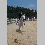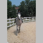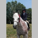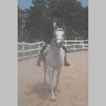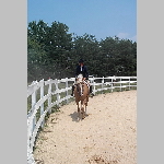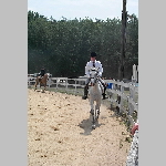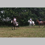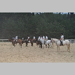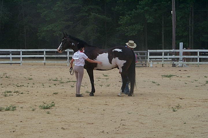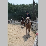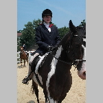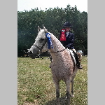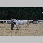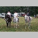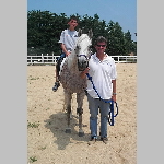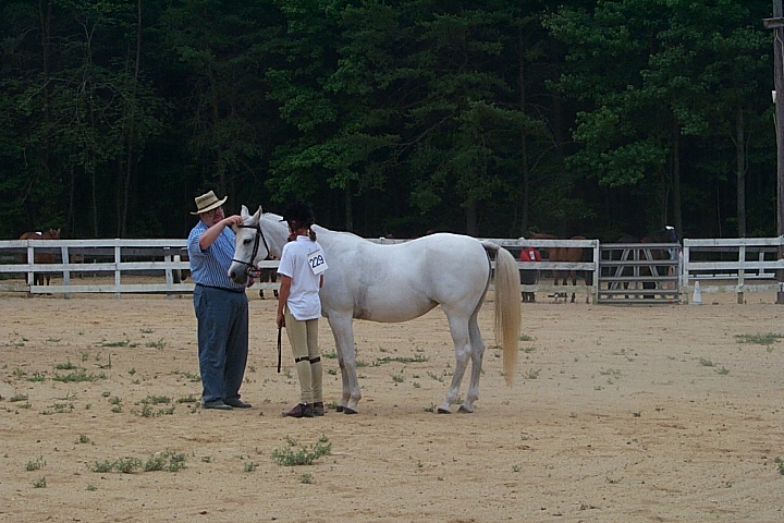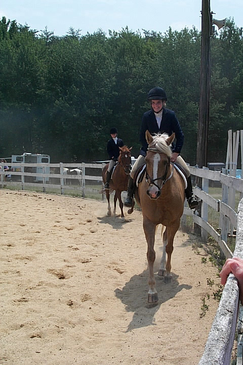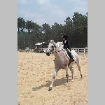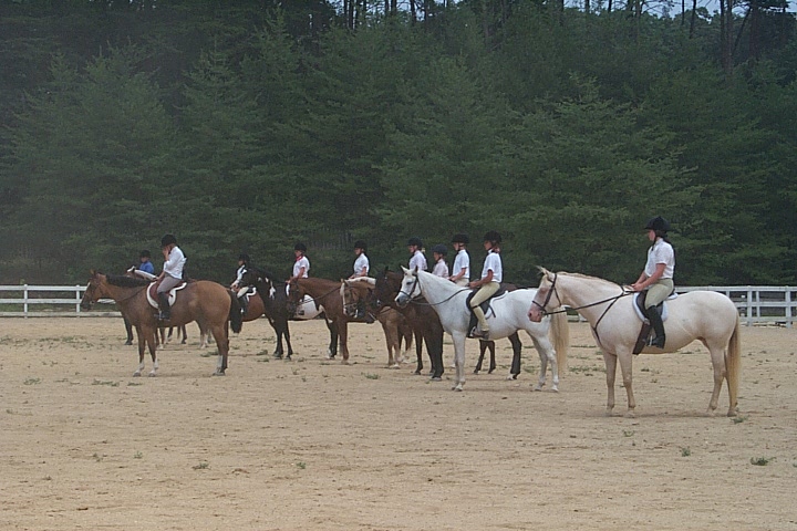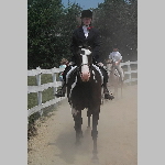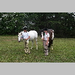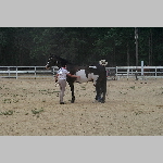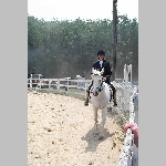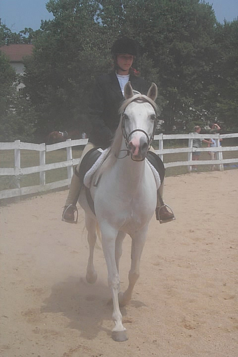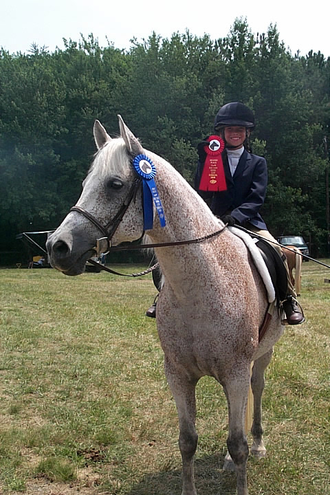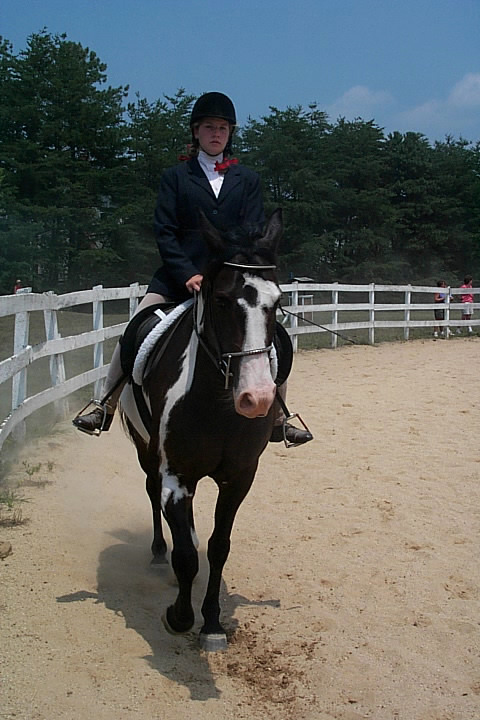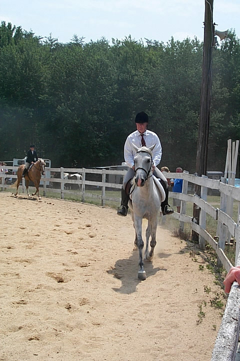 Here are a few snapshots of the girls at the July 20 Freestate Riding Club horse show. Other than the temperature being a bit on the steamy side, a good time was had by all. Many ribbons came home with us that day and the horses behaved very well. Jessica is the rider on Romeo, the black and white Paint/Arab gelding. Ali is on Silver Belle, the white Arab mare. Lydia is on Rocky, the Grey Arab gelding. Finally, Erika is on Sunny, the Palomino gelding. Romeo, Silver, Rocky, and Erika are all instructors at Obligation Farm. Click on any picture to see a larger version.